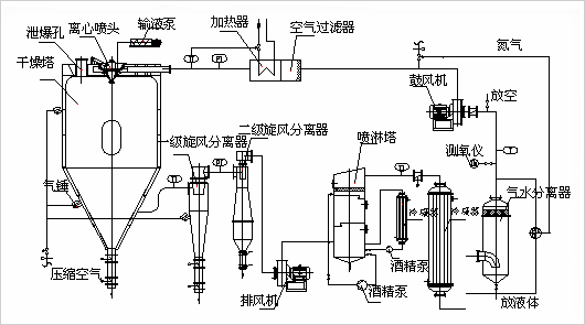 首先在干燥塔体内充入被加热的氮气,被干燥的液态物料经输液泵输送至喷头处,液态物料被雾化器雾化成细小液滴,液滴在干燥塔内与热氮气进行充分的热交换,物料中的液态部分被瞬间蒸发,固态部分形成的粉状物料沉于塔底,干燥的粉状物料从塔底排出。其中,被蒸发的有机溶剂气体在风机的作用下,通过旋风分离器、喷淋塔等装置把附着在气体中的粉尘进行除尘处理,再经冷凝器把除尘后饱和有机溶剂气体冷凝成液体排出冷凝器。其间,作为干燥介质的惰性气体被连续加热后作为干燥载体在系统内重新循环使用。